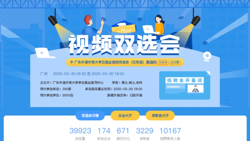 和江同学相似,英文学院研究生叶同学已经拿到了offer,同时也参加了3月份学校的“云招聘”,她获得了羊城晚报和白云山中一药业的面试邀请。叶同学提到,“虽然今年遭遇疫情,企业招聘的需求量在减少。但学校一直在实施帮扶政策,加上国家出台相应的对策,我还是抱有希望的,让自己多多尝试。”