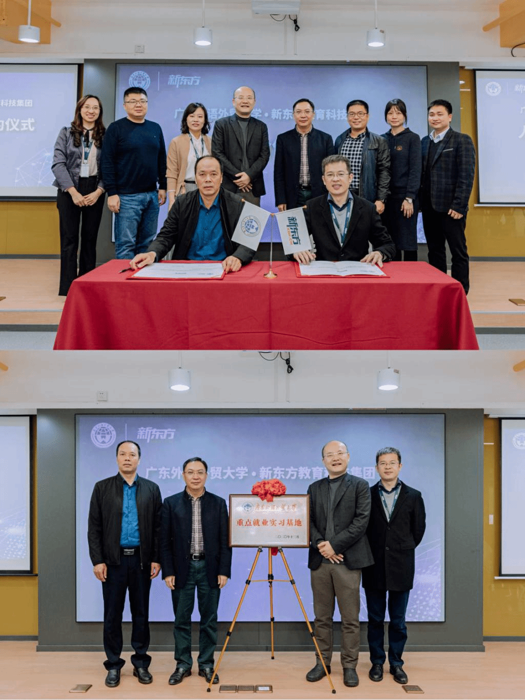 仪式上,康为茂代表学校与新东方教育科技集团签订人才战略合作协议,刘海春与张戈共同进行“重点就业实习基地”揭牌仪式,揭开了双方深度合作的序章。