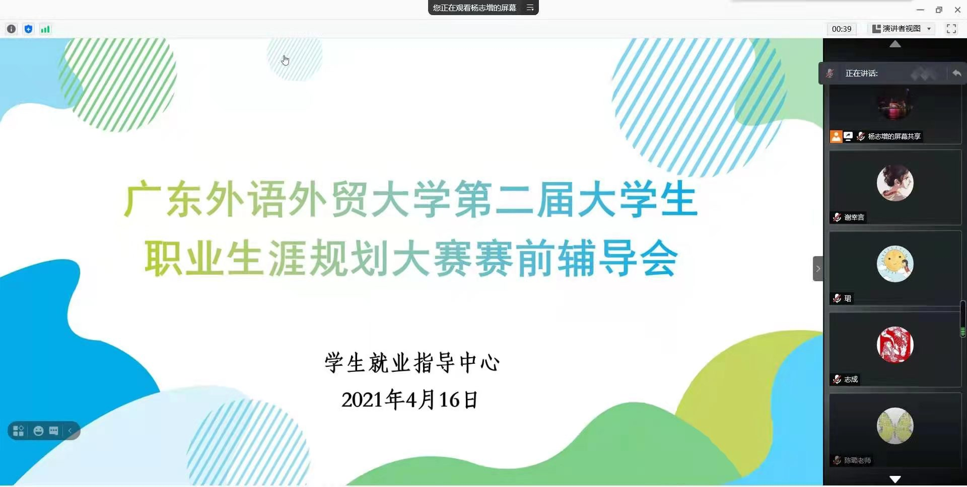 陈璐从新时代就业指导课程面临的困境以及大学生对就业指导课程的期望引入本次教学大赛的相关内容,并围绕课程教学大纲、课堂教学设计、教学实施和教学反思等核心模块进行讲解和分享。最后结合自身参赛经历,就大赛目标、赛制、所需筹备的材料等问题与老师们进行了深入交流。