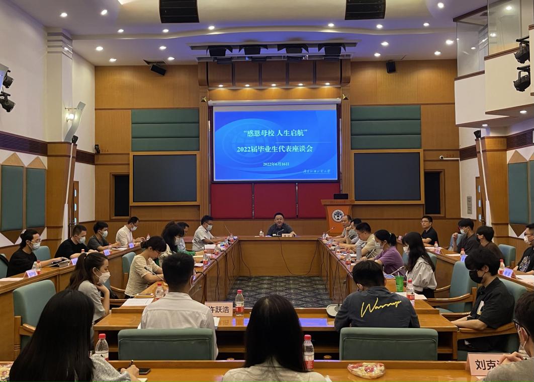 6月16日下午,以“感恩母校 人生启航”为主题的2022届毕业生代表座谈会在北校区行政楼国际会议厅召开。校党委副书记唐锐,学生工作部(处)、研究生工作部、校团委、学生就业指导中心、教务处、校友事务与合作发展处相关负责人,2022届毕业生代表等参加座谈。