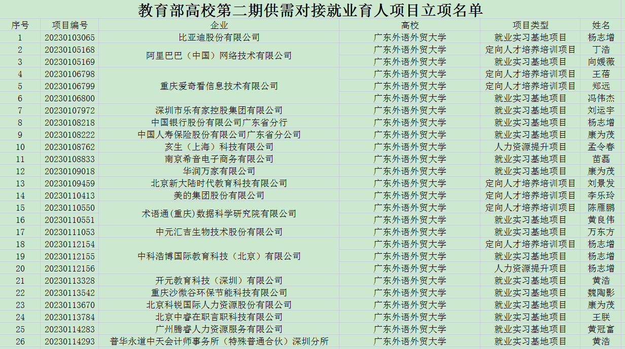 近日,教育部高校学生司印发《关于公布第二期供需对接就业育人项目立项名单的通知》(教学司函〔2023〕6号),我校与省内外20个企业联合申报的26个项目获批立项。立项数在全国外语类院校中排名第1,省内高校中排名第1。