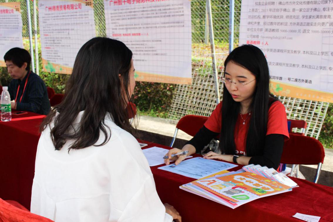 此次招聘会还吸引了校友企业参加。我校英文专业毕业生,现校友企业佛山方外英语的招聘负责人于方为分享了面试经验:“自信、个人魅力、感染力非常重要,而且好的口语无论找什么工作都是自己的一张名片。”她也表示相信学弟学妹们的能力,很希望招到母校毕业生。
