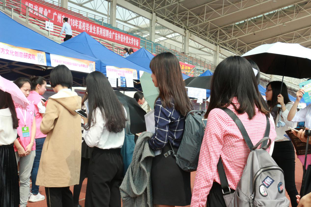 2018年4月1日,广州市“阳光就业”高校毕业生招聘会(广东外语外贸大学专场)在广外大学城校区田径运动场举行。当日广州的气温便“扶摇直上”,直逼30摄氏度,但燥热的天气也难挡毕业生们追梦的步伐与用人单位招贤纳士的心。此次招聘会共有200多家用人单位到场揽才,其中不乏广药集团、广发证券、中国人寿保险、蓝月亮、唯品会等大型企业,吸引了众多我校以及外校的毕业生前来应聘。