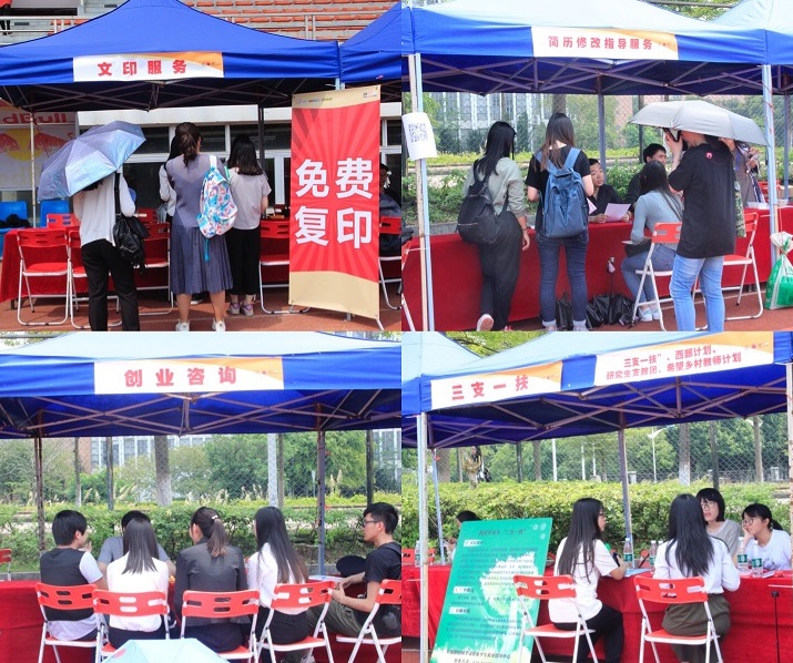 本次招聘会由广州市人力资源和社会保障局主办,中国南方人才市场(广州市高校毕业生就业创业指导中心)、广东外语外贸大学承办,广州南方人才大学生就业市场有限公司、广州市青年就业创业协会、南方人才网协办。本场招聘会有4个突出特点。一是通过“互联网+”模式进一步提升了工作效率。学校与广州市高校毕业生就业创业指导中心合作,使用智能就业平台系统,用人单位从报名、资料提交、审核确认到参会通知,均通过网络完成,在便利用人单位的同时,提高了招聘会的筹备工作效率。二是为用人单位提供全程免费贴心服务进一步提升服务水平。本场招聘会不收取参会单位任何费用,为每家参会用人单位提供一个标准招聘摊位(包括帐篷、宣传横眉、桌椅以及饮用水等服务),每两个摊位配备专职志愿者一名,学校也从会前的参会指引,到会场招聘和会后面试提供了一系列贴心的服务。三是设置功能齐全的服务区进一步提升服务效能。现场设置两块功能齐全、各有侧重的服务区,现场指挥部旁设置求职咨询、简历修改指导、创业咨询、三支一扶政策咨询、医疗服务、安保服务、综合服务等功能区;面试区旁则设置求职学生休息区、复印点、餐饮服务区等功能区。四是强化各方安保投入进一步提升安全保障。在番禺区公安局、小谷围派出所的直接参与和指导下,学校在活动现场及周边布置了充足的安保力量,确保招聘会安全有序的进行。