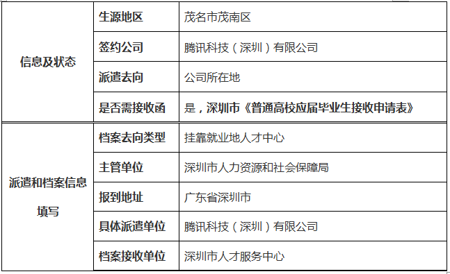 注:根据深圳市接收院校应届毕业生相关规定,获《普通高校应届毕业生接收申请表》接收并派遣到深圳市的毕业生须同时入户深圳,即户口档案应同时到深圳。深圳接收单位除中共深圳市委组织部、深圳市教育局、深圳社会发展研究中心、深圳海关、深圳出入境边防检查总站、深圳出入境检验检疫局、深圳海事局这7个用人单位不需开《普通高校应届毕业生接收申请表》外,其他接收单位都需上传《普通高校应届毕业生接收申请表》,可以通过用人单位申请或个人申请(深圳市《普通高校应届毕业生接收申请表》)。