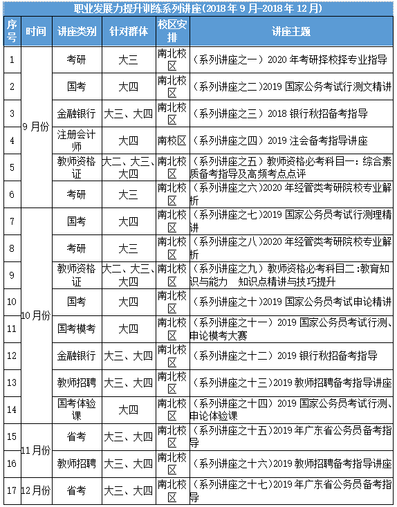 附2018-2019学年度职业发展力提升训练系列讲座安排: