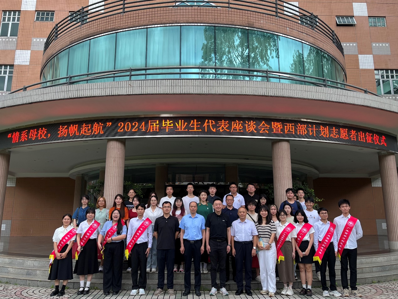 6月24日上午,我校在白云山校区第二会议室召开以“情系母校 扬帆起航”为主题的2024届毕业生代表座谈会暨西部计划志愿者出征仪式。校党委副书记唐锐,校团委、研究生院、学生就业创业中心、校友事务与合作发展处相关负责人和2024届应届毕业生代表参加座谈会。