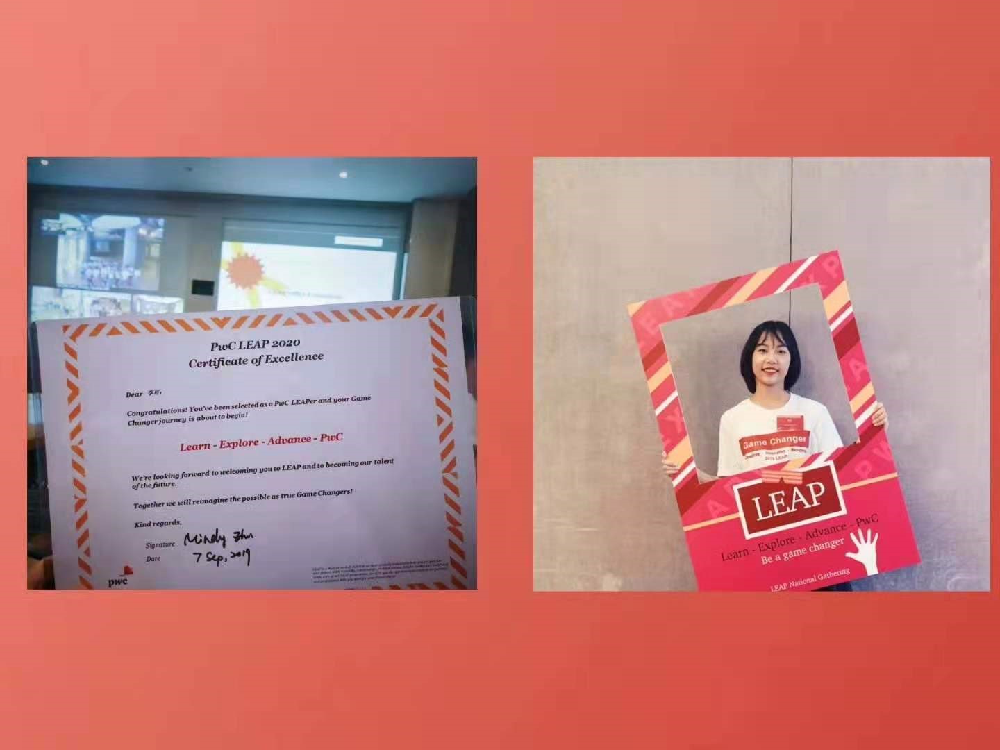 在大学四年打怪升级中,李可学会把握住机会每一个机会,向成功不断迈进。她通过实验室师兄师姐了解到四大会计事务所,那时却已经错过了普华永道在广外的校招宣传。她通过自己攻略,对普华永道针对大一大二同学的LEAP项目产生浓厚兴趣,却发现已经错过了报名时间。她还是想再试试,便谨记师兄说的“带上简历”,独自去到隔壁中山大学听普华永道在大学城的最后一场校招宣传。宣讲会之后,她鼓起勇气和普华的HR聊天,询问大二同学是否有可能获得实习机会,HR向她要了简历。隔天,我便收到了HR的来电,一番交谈之后便向我抛出了LEAP项目的橄榄枝。就这样,她在没有经历一面和二面的情况下,直接进入最终面,并从全国八千多候选者里脱颖而出,成为LEAP项目的一员。