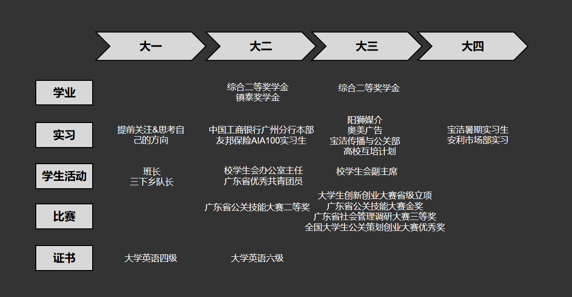 这个表是我大学四年做的一些主要的事情的汇总。选择直接就业,首先要关注的就是实习,高含金量的实习能够为我们在求职时做很好的背书,例如,宝洁的summer intern。因为宝洁完善的培养体系、early responsibility并且每年全国只招几十人,我们同届在毕业后基本都去到了宝洁、华为、字节跳动等知名大厂。但大厂实习毕竟可遇不可求,就算一开始在一些较小的公司实习,在实习中积累的对于这个行业的认知、对于如何做好这个岗位的思考、在一些日常工作中主动做出的小改进都是在求职中让面试官选择你的理由。