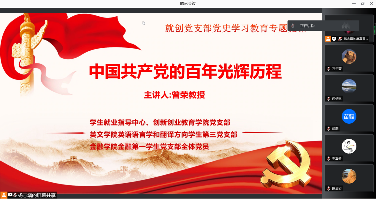 为深入开展好党史学习教育,扎实推进“我为群众办实事”实践活动,学生就业指导中心、创新创业教育学院党支部与英文学院英语语言学和翻译方向学生第三党支部、金融学院金融第一学生党支部结对共建。三个共建支部于6月24日下午联合举办了“师生共建共学,砥砺初心使命” 党史学习教育专题党课。本次党课主题为“中国共产党百年光辉历程”,由我校党史学习教育宣讲团成员、马克思主义学院曾荣教授担任主讲。