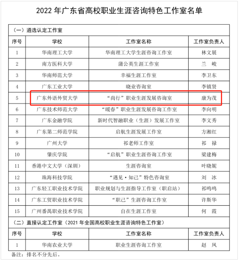 本网讯 近日,广东省教育厅公布了2022年广东省高校职业生涯咨询特色工作室名单,我校“尚行”职业生涯发展咨询室成功入选。据悉,全省共16个工作室获评。